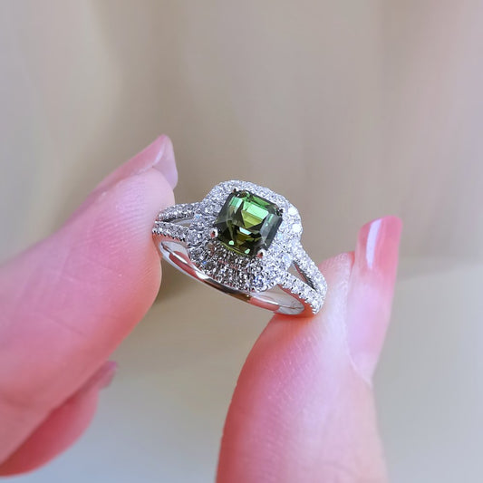 18K Double Halo Cushion Green Sapphire Ring