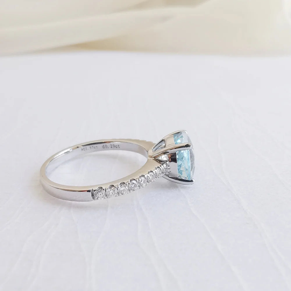 Decorate your fingers with this stunning statement aquamarine ring! Set in 18k white gold, this beauty is held up by 4 claws and is further embellished with little white round brilliant cut diamonds all along the top shoulder of the band.